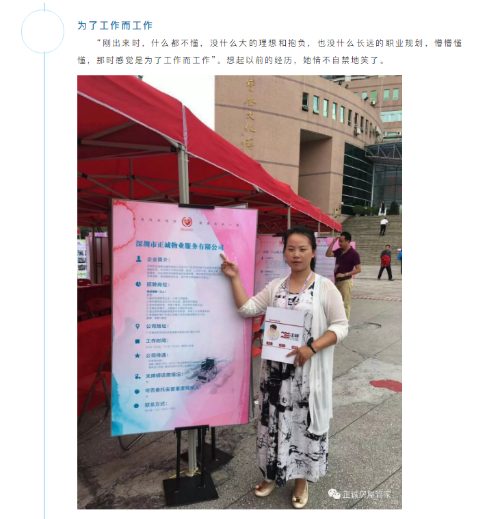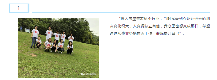 “进入房屋管家这个行业,当时是看到介绍她进来的朋友变化很大,人变得独立自信,我心里也想变成那样,希望通过从事业务销售类工作,锻炼提升自己”。