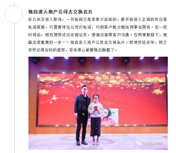 最困难的第一步踏出去后,后面的事情就顺理成章了。阿兰凭着一颗勇往直前、单纯而真诚的心,慢慢开拓自己的市场。几年来,她业绩逐步提升,逐渐成为公司存房量最多的“管家王”。阿兰一直心存感恩,她非常喜欢现在的工作,她说在正诚做管家,让她变得自信,变得更漂亮!