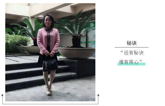 很多人问她“鱼和熊掌兼得”的秘诀,她坦然,“没有秘诀,惟有用心”。生活上,作为非常传统的广东客家女人,孝敬父母、抚育小孩,在她看来天经地义,下班后都是往家里跑,极少有个人空间,家里的各项事务她都操持的妥妥当当。工作上,虽然论长相、学历、谈吐等各方面,她都不占优势,但她每一样都做的很认真,很用心。她相信,笨鸟先飞,天道酬勤,路遥知马力日久见人心。