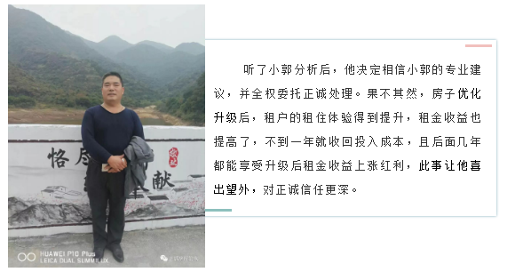 听了小郭分析后,他决定相信小郭的专业建议,并全权委托正诚处理。果不其然,房子优化升级后,租户的租住体验得到提升,租金收益也提高了,不到一年就收回投入成本,且后面几年都能享受升级后租金收益上涨红利,此事让他喜出望外,对正诚信任更深。