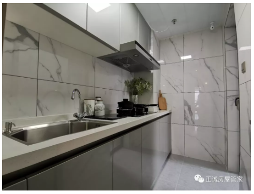 阳光透过窗户,落在白色大理石台面上,与厨具的影子形成莫名的契合。