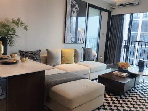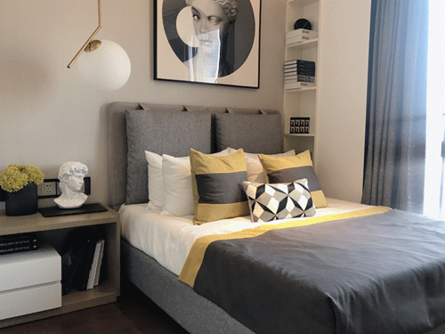 主卧设计了嵌入式衣柜,及床头的角落也设计了嵌入式架子,超大收纳空间,黄灰基调及抽象艺术画,触碰你内心的柔软。