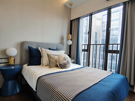 次卧是蓝灰基调,同样是嵌入式衣柜节约空间,奶白金属灯彰显个性。采光非常好,阳光能到达每一处角落。