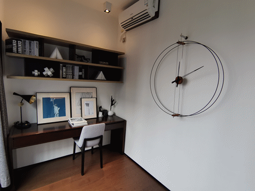 书房设计落地窗,通风采光超级好,能让你冥想之余身心得到放松,多种灯光结合,保护你的眼睛,墙上的艺术钟表特别有文艺气息。