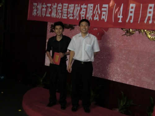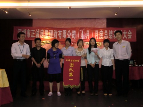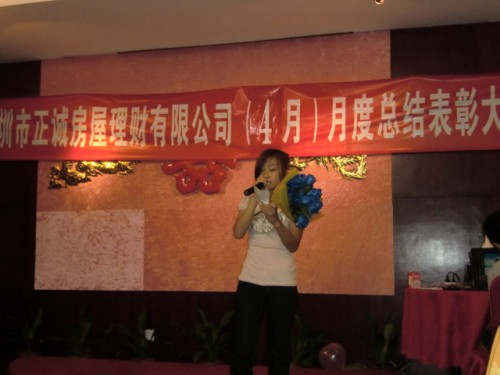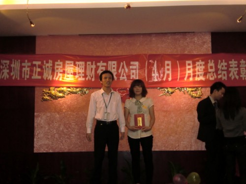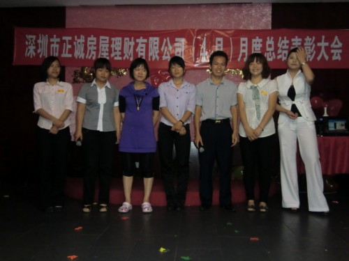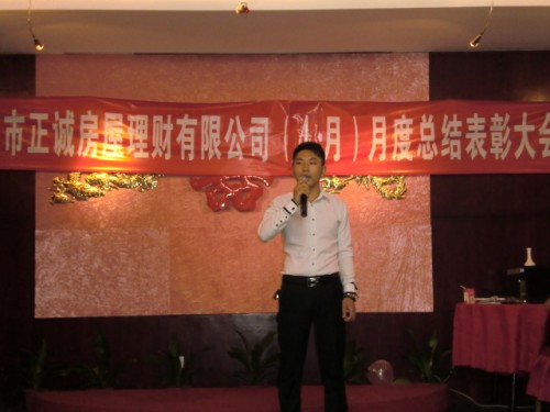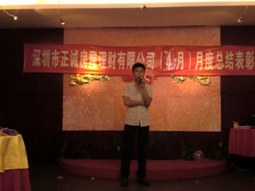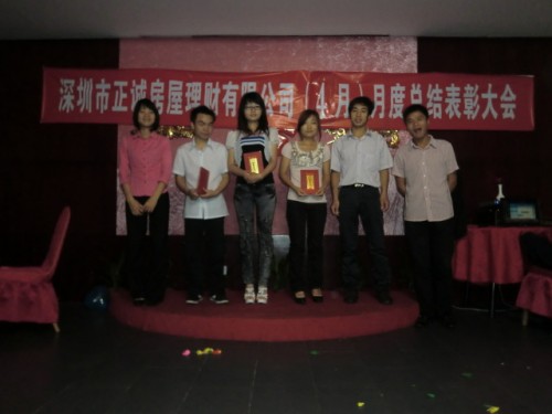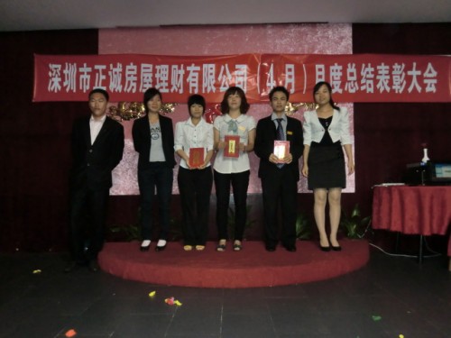 5月4日上午9时,正诚房屋理财的4月份总结表彰大会在宝安区汇湘阁三楼隆重召开。大会总结了公司4月份的工作情况,评选了个人业绩冠军、团队业绩冠军、最佳新人成长、房源开拓、单王及最佳勤奋等奖项。公司金总以及各个部门的经理和员工均出席了这次会议。
