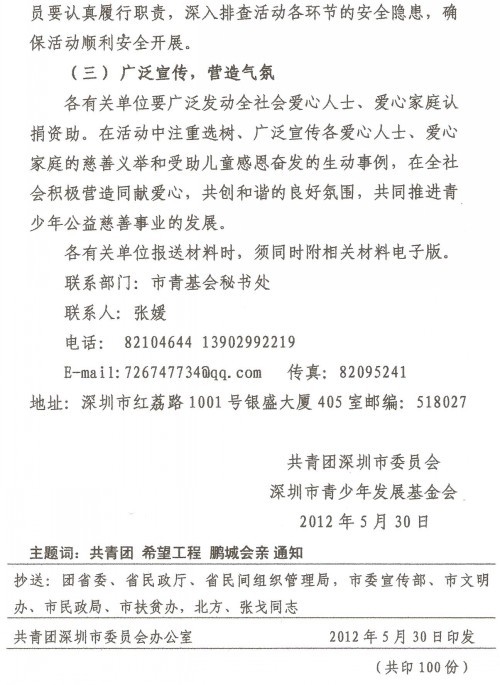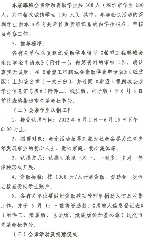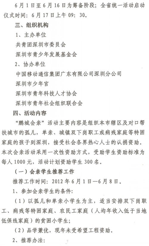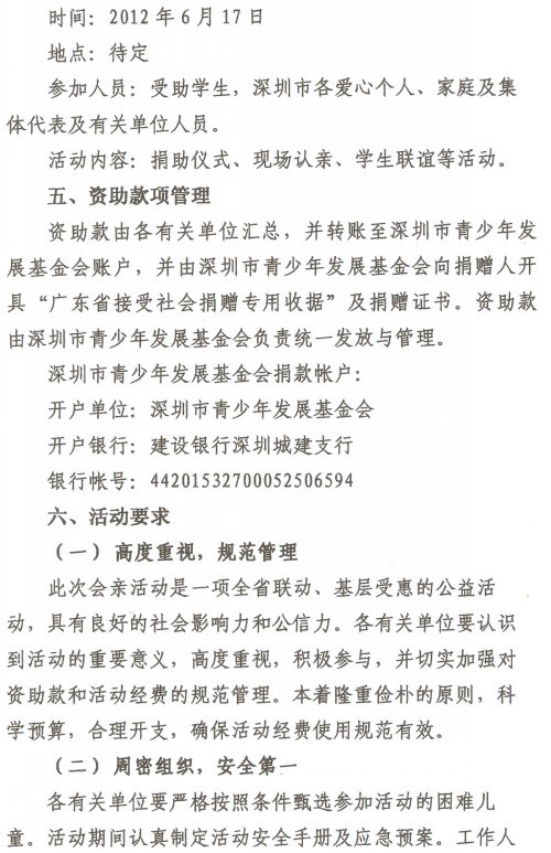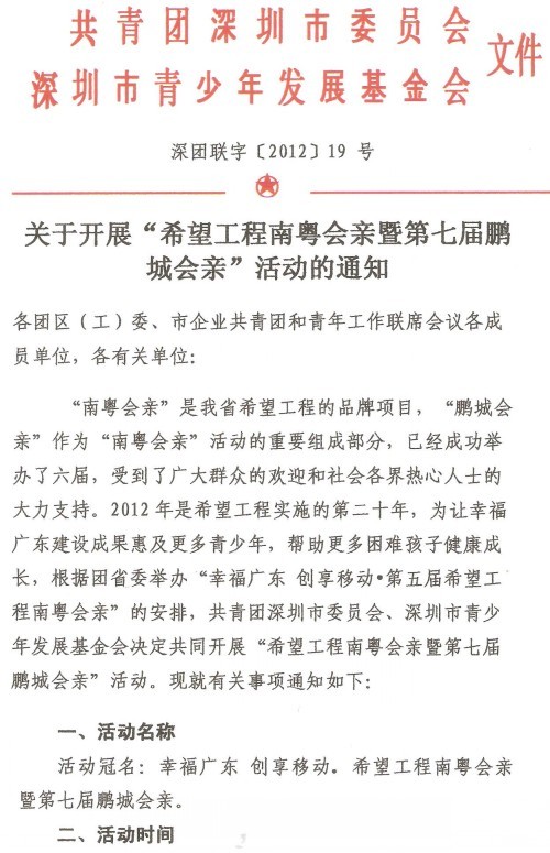 2012年6月17日上午,由深圳团市委、深圳市青基会共同主办的第七届“鹏城会亲”活动拉开序幕。100余名来自深圳、雷州、紫金、和平和揭西等地的学童在市少年宫欢聚一堂,接受深圳爱心人士一对一资助。