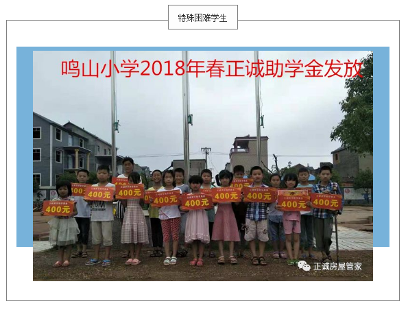 『正诚奖学助学金』由深圳市正诚物业服务有限公司捐资,联合江西革命老区鄱阳县银宝湖鸣山小学于2015年6月设立。基金专用于奖励优秀学生、资助困难学生,以及对部分教学成绩优异的老师的激励。