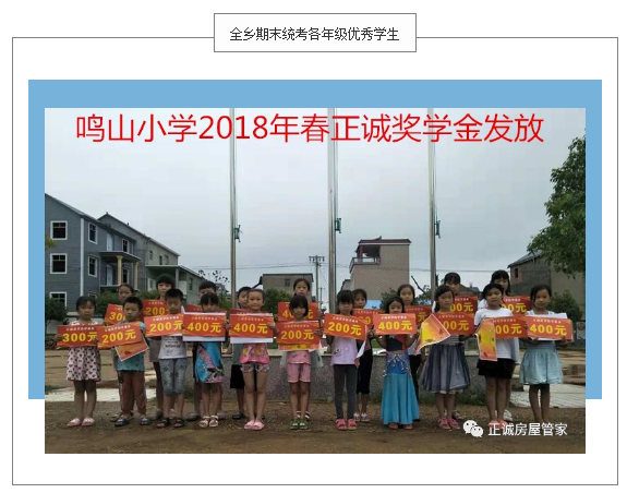 经过正诚奖学助学金监管委员会的统计、审核,对银宝湖乡2018年全乡期末统筹考试中鸣山小学各年级前三名的20名优秀学生、5名优秀教师,以及17名特殊困难学生,依据《正诚奖学助学金章程》分别发放了奖学助学金。