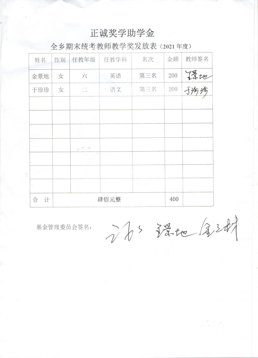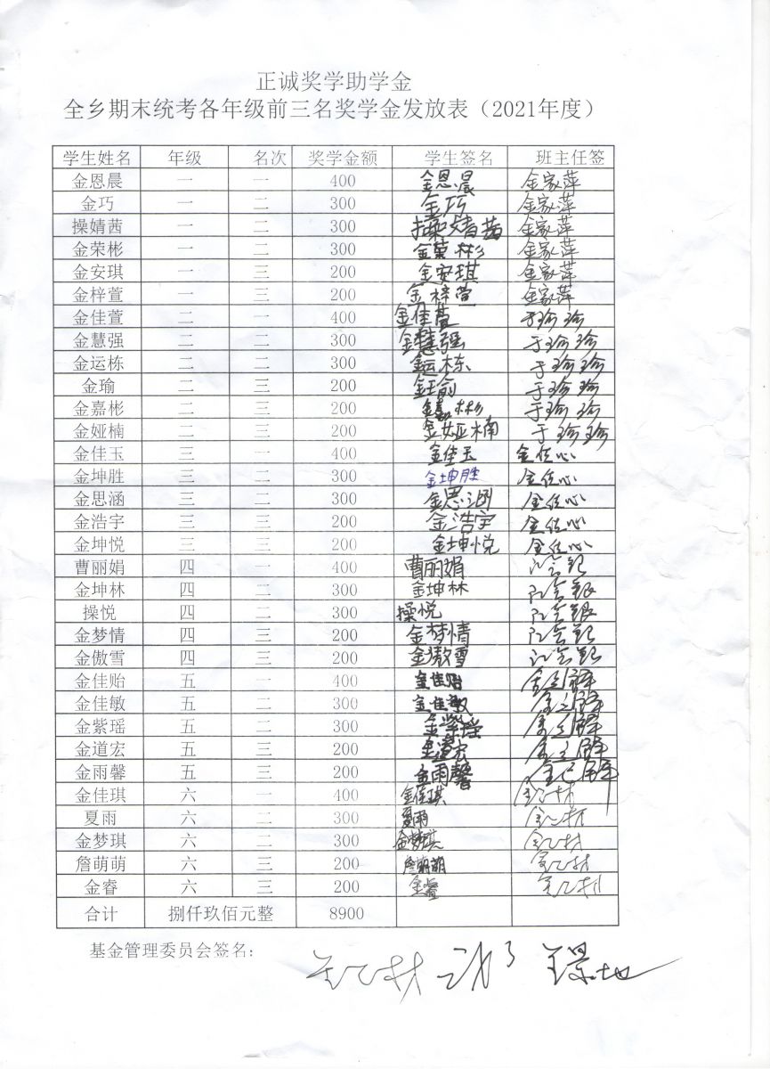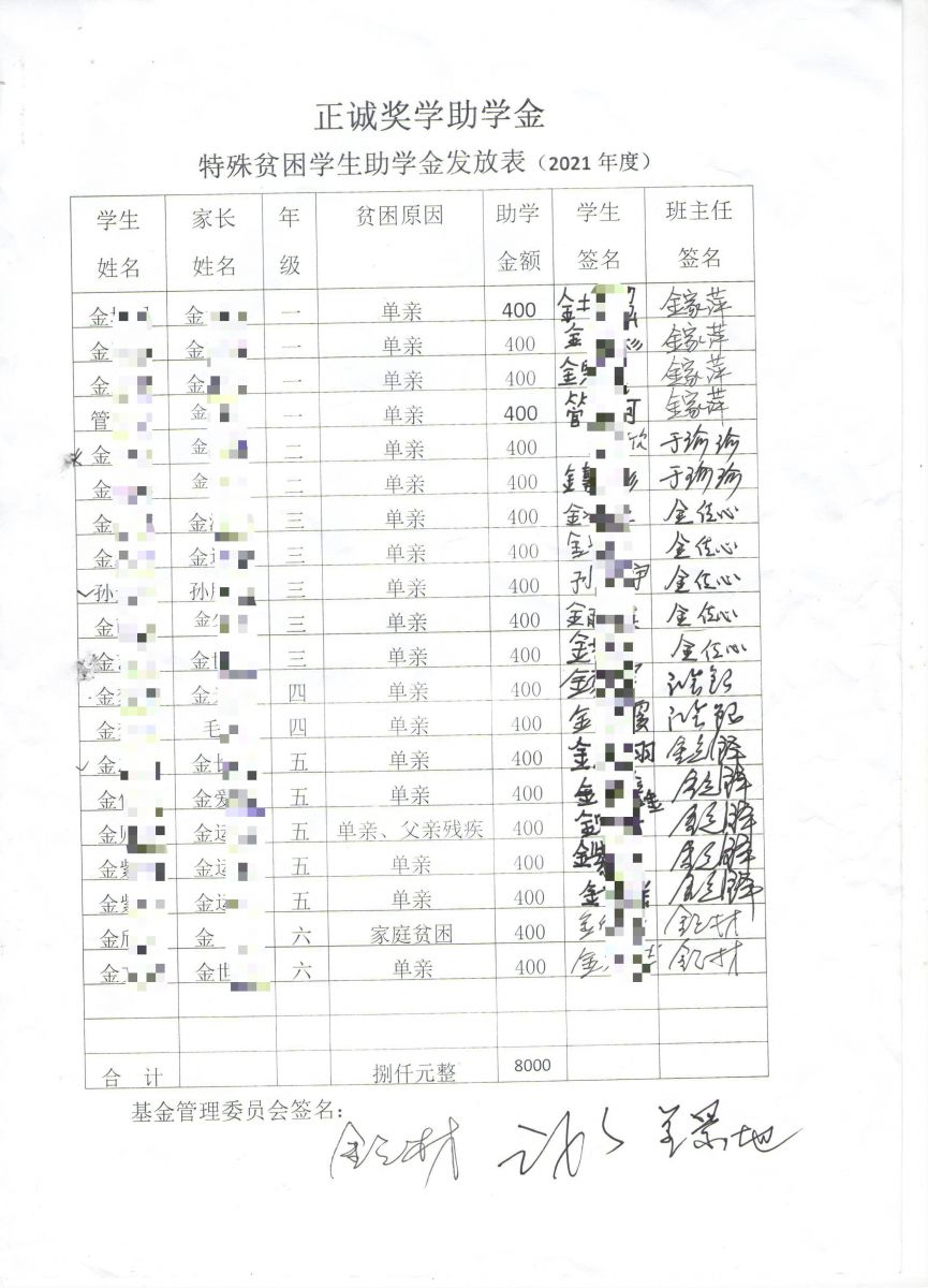 经过正诚奖学助学金监管委员会的统计、审核,对银宝湖乡2021年全乡期末统筹考试中鸣山小学各年级前三名的32名优秀学生、2名优秀教师,以及20名特殊困难学生,依据《正诚奖学助学金章程》分别发放了奖学助学金。